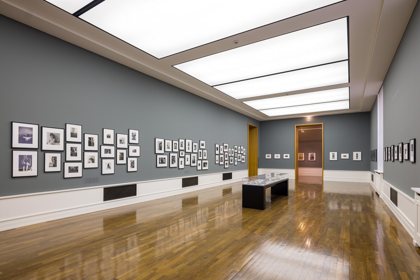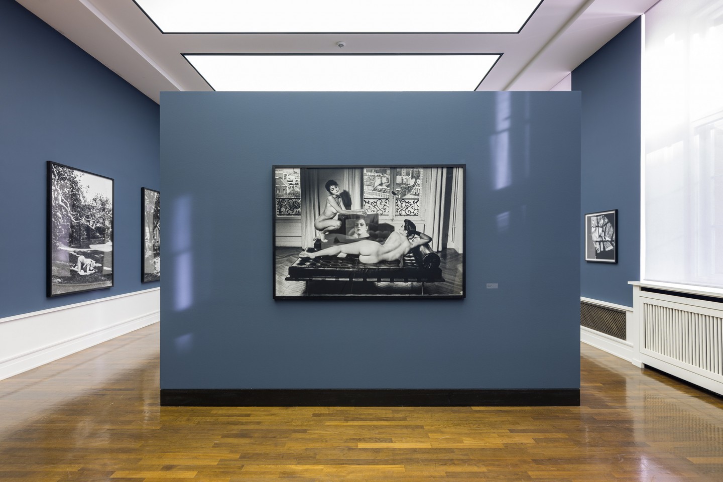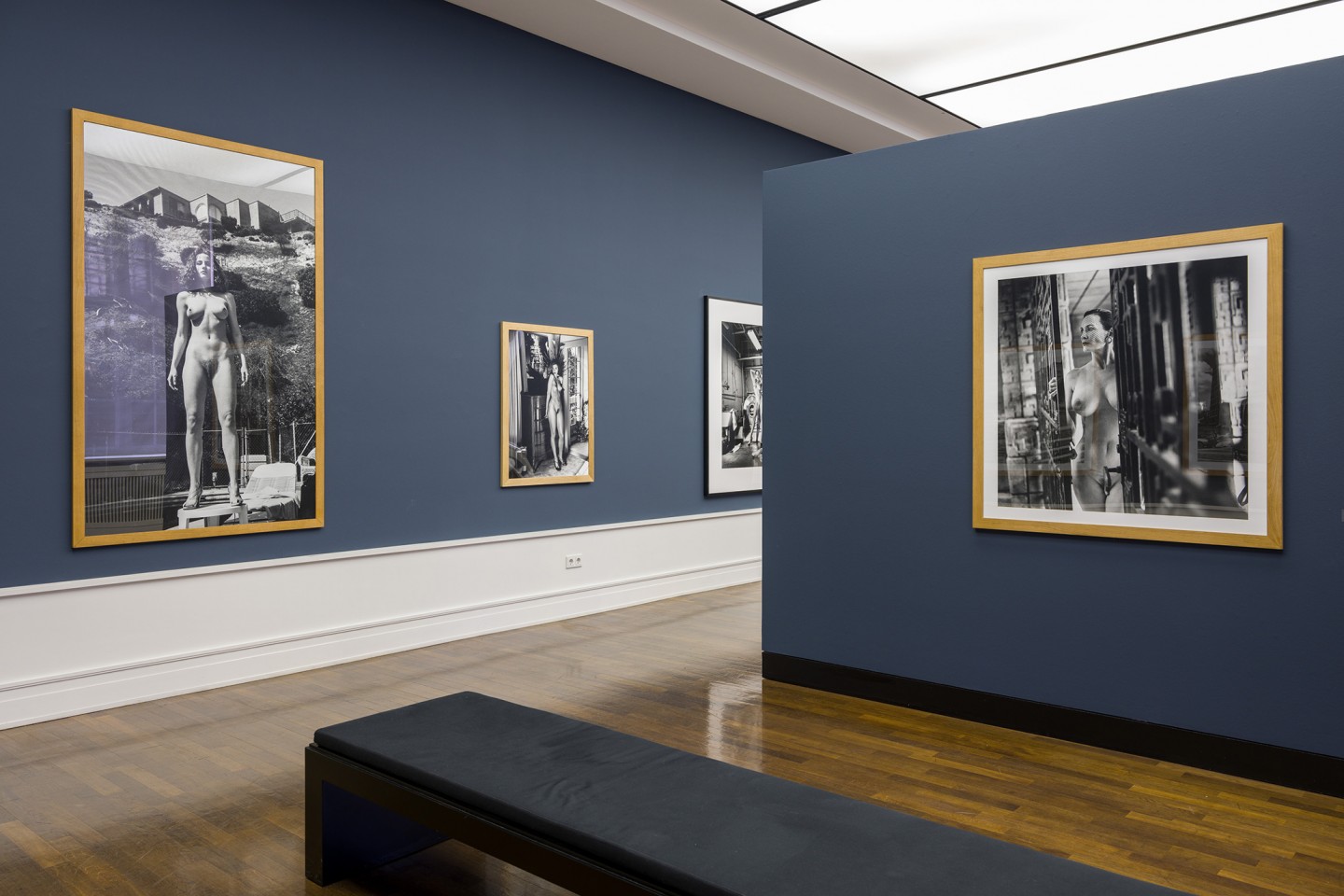 Anders als David Lynch zeichnete Helmut Newton die Aufnahmeorte seiner Mode- und Aktbilder immer wieder genau nach, stilisierte sie mitunter ebenso wie die Modelle in seinen Aufnahmen, sei es ein panoramatischer Ausblick auf die Stadt Paris als mediale Transformation eines Velasquez-Gemäldes , die lang gezogene Treppe in seinem Pariser Wohnstudio oder ein Zimmer in der Berliner Pension Florian mit einer ziemlich verruchten Historie. Newton begann mit der Aktfotografie in den 1970er-Jahren, diesseits und jenseits seiner Modebildproduktion, und hat bis zu seinem Lebensende 2004 regelmäßig in diesem Genre gearbeitet. Seine Serie Naked and Dressed, die den Übergang vom Mode- zum Aktbild in seinem Werk markiert, und die Big Nudes machten ihn Anfang der 1980er-Jahre weltberühmt und inspirierten zahlreiche Kollegen und bildende Künstler zu Nachahmungen oder Neu-Interpretationen. Bis zu seinem Tod schuf er ein unvergleichliches, rätselhaftes Werk voll subtiler Verführung und zeitloser Eleganz – auch und besonders im Akt-Genre, mit dem er manch gängige Tabus verschob oder ignorierte. Es wurde immer wieder, ganz im Gegensatz zum Aktbildwerk Leiters, bereits zu seinen Lebzeiten publiziert, teilweise entstand es sogar im Auftrag von Magazinen wie Playboy oder Oui. Zudem gelang es Newton, manche seiner frei entstandenen Aktaufnahmen in Mode- und Lifestyle-Magazinen unterzubringen. Die aktuelle Präsentation vereint mehr als 70 solcher Ikonen aus seinen bekannten Ausstellungen und Projekten, etwa Helmut Newton’s Illustrated: Pictures from an Exhibition, White Women, Sleepless Nights, Big Nudes, Sex and Landscapes, Work oder Us and Them, sowie etwa 30 bislang ungezeigte Werke aus dem Stiftungsarchiv, darunter zahlreiche Original-Polaroids in einer Vitrine. Mit diesen bereitete er – in den 1970er- und 1980er-Jahren, also in der vordigitalen Zeit des Mediums – seine finalen Bildkompositionen vor, in der Mode- wie der Aktfotografie. Gezeigt werden ganz unterschiedliche Aktaufnahmen von Newton: Porträts nackter Menschen an Swimmingpools, raffinierte Aufnahmen unbekleideter Schaufensterpuppen und andere modebasierte Aktbilder, halbnackte Modelle mit orthopädischen Stützprothesen, amüsante Interaktionen zwischen Mann und Frau oder provokante Inszenierungen sexueller Obsessionen in weiblicher Besetzung, die in unserer Rezeption vielen Imaginations- und Assoziationsmöglichkeiten Platz lassen.
