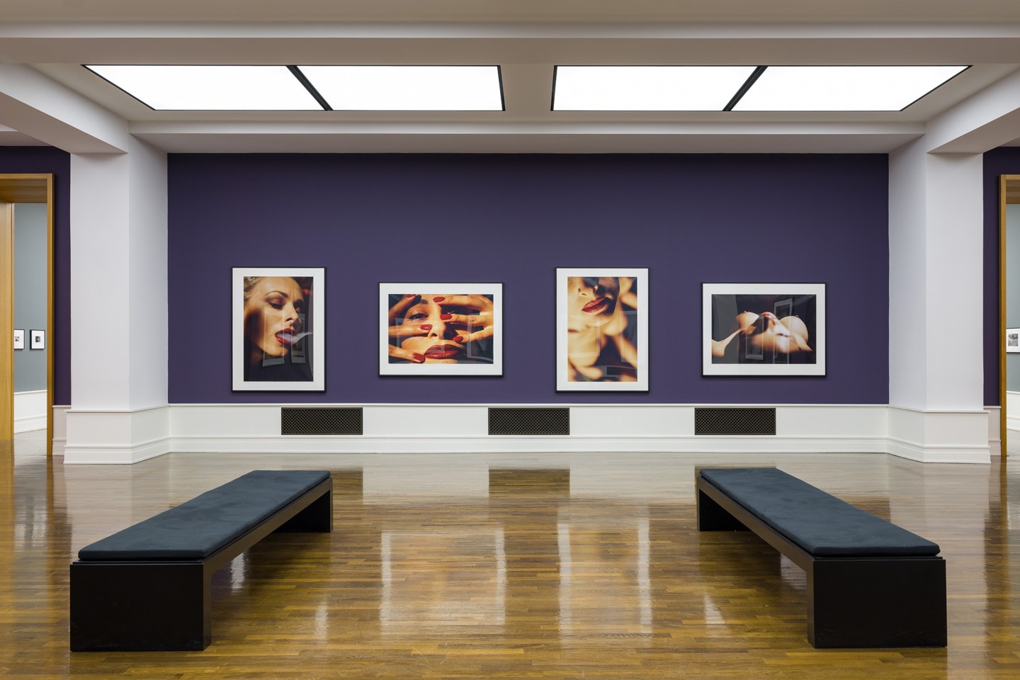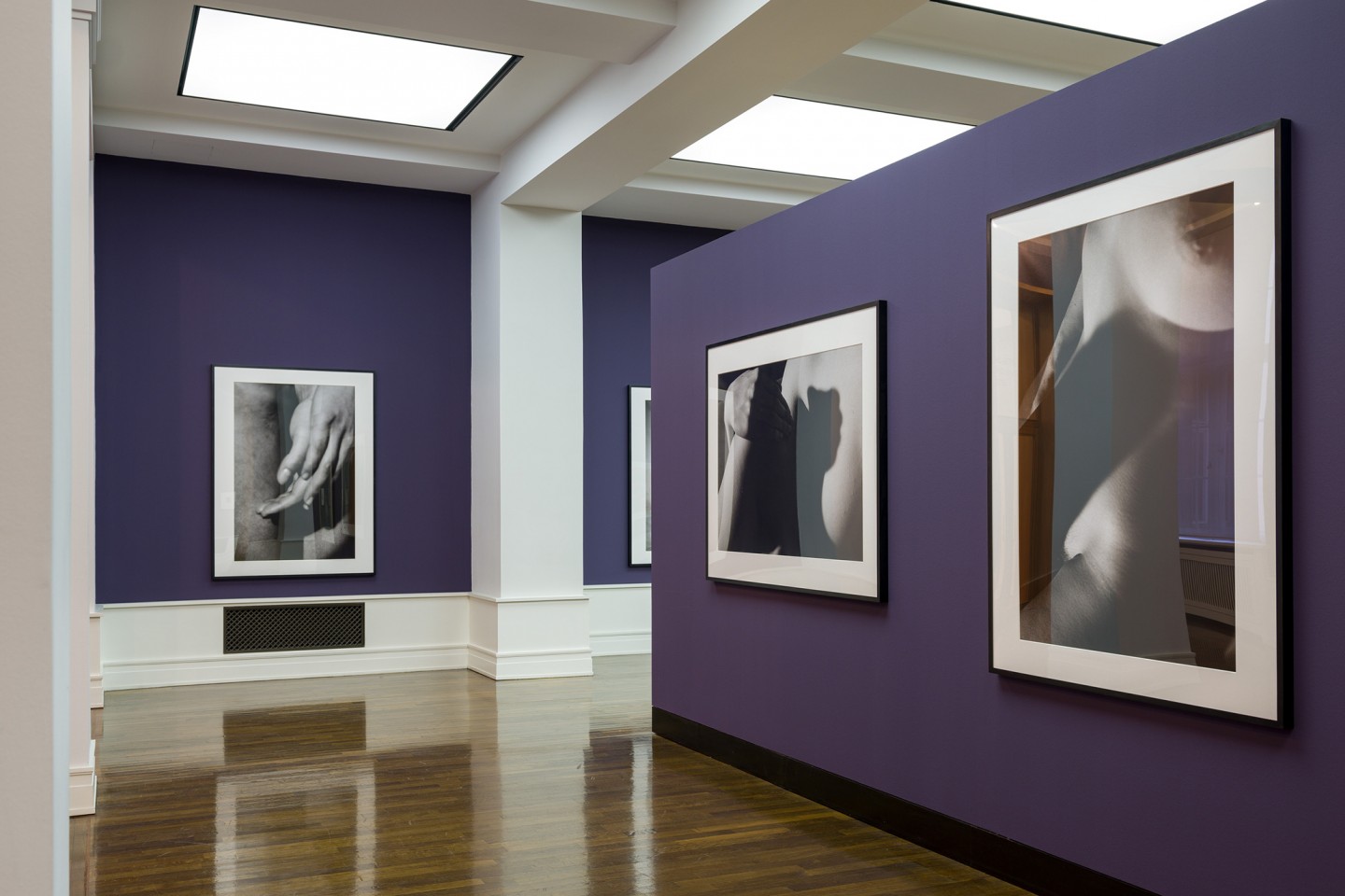 Eine ähnliche Bildstimmung wie bei Saul Leiter begegnet uns mitunter auch bei den Aktaufnahmen von David Lynch (*1946), die ein knappes halbes Jahrhundert später, vor allem in Lodz und Los Angeles, entstanden sind und ebenfalls zunächst in Buchform im Verlag der Pariser Fondation Cartier (Nudes, 2016) veröffentlicht wurden. Es sind abstrakte Körperbilder, gelegentlich vollformatige Details, die meisten in Schwarz-Weiß, einige wenige in Farbe, die wir manchmal erst auf den zweiten Blick mit einem menschlichen Körper in Verbindung bringen. Lynch wählte während des Arbeitsprozesses ungewöhnliche Perspektiven und Licht-Schatten-Kontraste sowie anschließend ein großes Bildformat, das die weiblichen Modelle annähernd lebensgroß erscheinen lässt; die 22 ausgewählten Motive sind erstmals und exklusiv für die Berliner Ausstellung zusammengestellt und vergrößert worden. Lynchs Aktaufnahmen entstehen parallel zu und autonom von seinem filmischen Werk, in dem gelegentlich ebenfalls sexuelle Anspielungen und Handlungen zu sehen sind. Seine fotografischen Nudes – mal Beobachtung, mal Pose – wirken vergleichbar mysteriös wie seine Filme. Kaum ein Besucher wird das filmische Werk vor dem inneren Auge wohl ausblenden können, wenn er Lynchs Berliner Ausstellung sieht. Seine großformatigen Aktfotografien werden auf einem lilafarbigen Fonds präsentiert, der Lynchs Film Blue Velvet assoziieren lässt. Wir scheinen Lynchs vorsichtiges, ja zartes Umkreisen und Untersuchen des weiblichen Körpers mit der Fotokamera sogar noch in der Bildbetrachtung zu spüren; solche Imaginationen sind wohl nur mit dem Medium Fotografie möglich. Die Intimität – oder vielmehr die Illusion einer Intimität – entsteht hier durch die Motivik einer extrem nahansichtigen, geradezu taktilen Körperlichkeit, auch wenn wir nur einen nackten Oberschenkel, eine Schulter oder einen Arm im Bildanschnitt sehen. Die fotografierten, namenlosen Frauen sind – im Gegensatz zu dem Bildpersonal Leiters – professionelle Modelle, die in einem undefinierbaren Bildraum posieren, nur eine rekelt sich rauchend und verführerisch auf einem Sofa, einmal in Schwarz-Weiß, ein zweites Mal in Farbe, wobei auch hier der Innenraum geradezu kinematografisch unscharf und unkonkret bleibt.