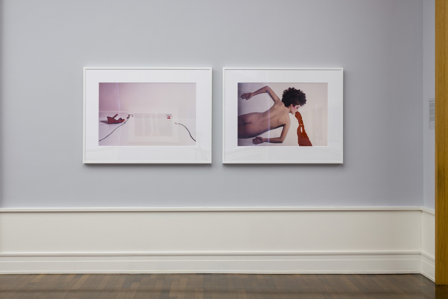 Auch Helmut Newton fotografierte bekanntlich immer wieder Schuhe, meist schwarze High Heels. In diesen steckten, wie wir in der aktuellen Ausstellung sehen, beispielsweise die Füße von Nadja Auermann, bekleidet mit dunklen, semitransparenten Strümpfen. Sie enden einmal am Oberschenkel, kurz unterhalb des Saumes eines kurzgeschnittenen schlichten schwarzen Kleides – und in einer zweiten Aufnahme verschwinden sie unter einem ebenfalls sehr kurzen weißen, gerafften Kleid, über das sich lange Tüllschleier des dazugehörigen Hutes legen. Newton hat das deutsche Supermodel für das exklusive italienische Label Blumarine 1994 mehrfach in Monte Carlo fotografiert, beispielsweise in der Nähe des berühmten Yachthafens im Fürstentum – hier jeweils in Untersicht, so dass Auermanns schlanke lange Beine noch ein bisschen länger erscheinen. Das Modell steht auf einer einfachen Betonfläche; einmal blicken wir mit dem Fotografen in Richtung Hafen und Spielkasino, also landeinwärts, das andere Mal – gewissermaßen als Gegenschuss – in Richtung Meer: Auf der einen Seite konkretisiert und verortet Newton die Aufnahmesituation, auf der anderen verklärt er sie durch eine simple Perspektivverschiebung. Sein Modell lächelt vom erhöhten Standpunkt in die Kamera respektive auf die Betrachter herab, dabei sind ihre Hände, wie so häufig in Newtons Modeaufnahmen, mit leicht abgespreizten Fingern weit ausgestellt.