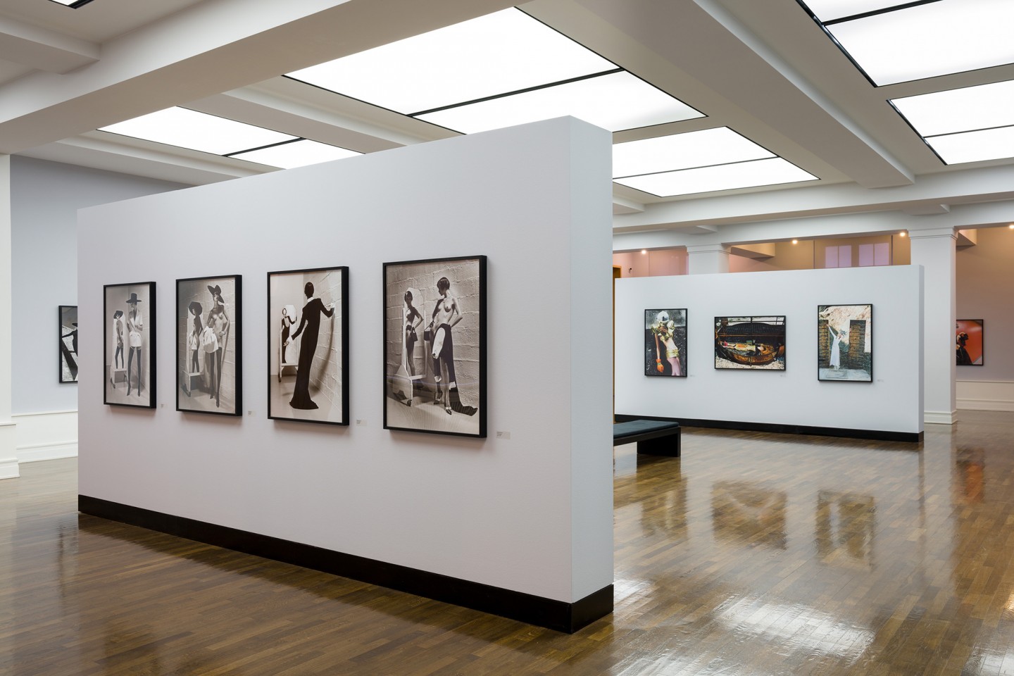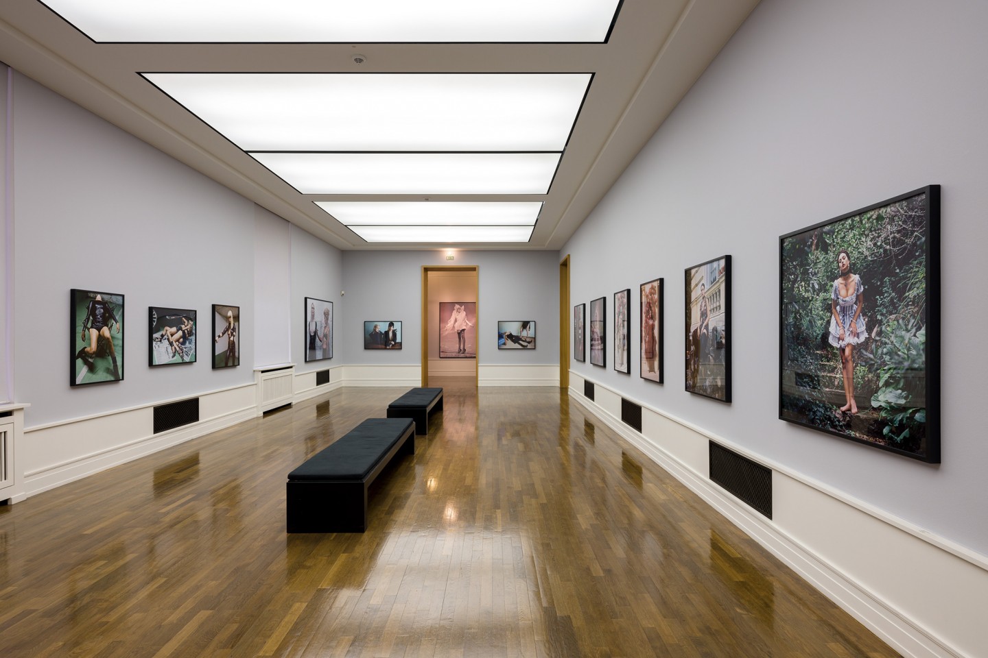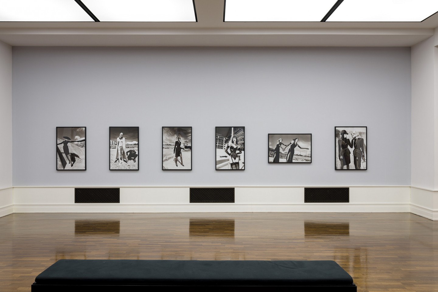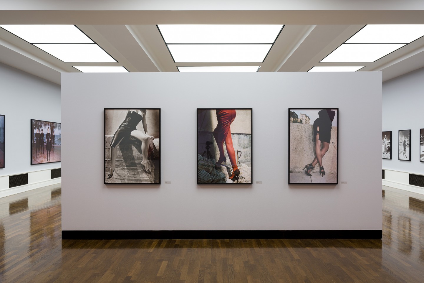 Helmut Newton realisierte in seinen späteren Mode- und Produktaufträgen häufig Sequenzen: etwa die Schwarz-Weiß-Bildgeschichte für Villeroy und Boch (1985), eine Farbaufnahmeserie mit Monica Bellucci in unterschiedlichen Kleidern von Blumarine (1998) oder mehrere Motive mit Bikini-Modellen für einen Sportmagazin-Kalender (2002). Die jungen Frauen trugen die knappe Badekleidung allerdings nicht wie üblich am Strand, sondern in der Wüste. Ergänzt werden die Serien oder Reihungen in der aktuellen Ausstellung durch Einzelbilder, aufgenommen für die deutsche, amerikanische, italienische, französische und russische Ausgabe der Vogue vor allem in und um Monte Carlo. Manche Modelle fotografierte er in der Garage seines Apartmenthauses in Monaco, gelegentlich unter Einbeziehung dort parkender Autos. Aus geradezu banalen Orten machte Newton kontrastreiche oder besonders reduzierte Bühnen für seine ungewöhnlichen Inszenierungen.